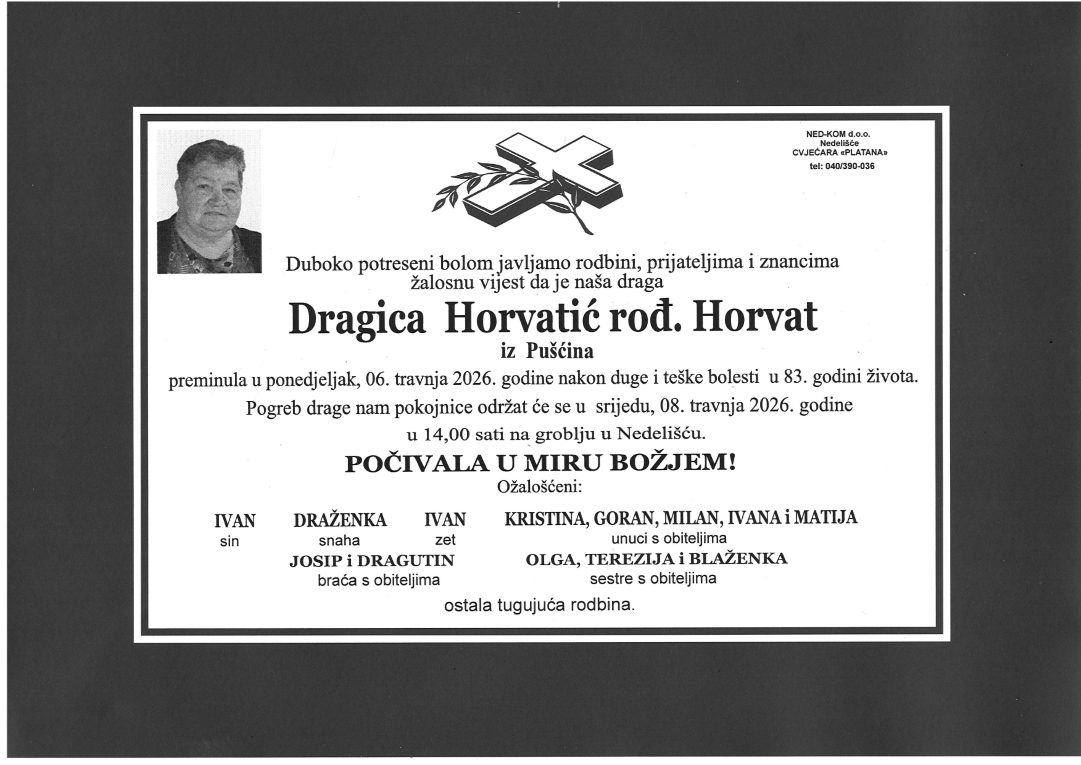 Ispraćaj će se obaviti u srijedu, 08.04.2026. u 14:00 sati na groblju u Nedelišću