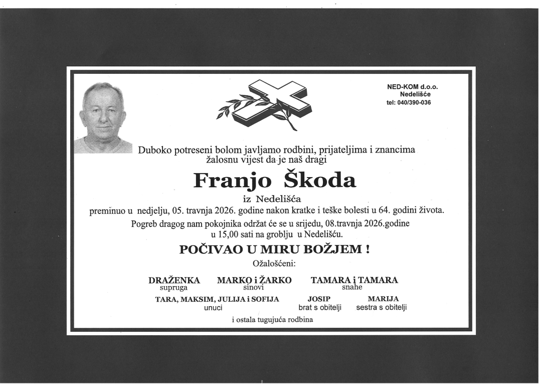 Ispraćaj će se obaviti u srijedu, 08.04.2026. u 15:00 sati na groblju u Nedelišću
