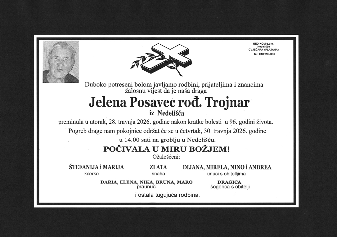 Ispraćaj će se obaviti u četvrtak, 30.04.2026. u 14:00 sati na groblju u Nedelišću