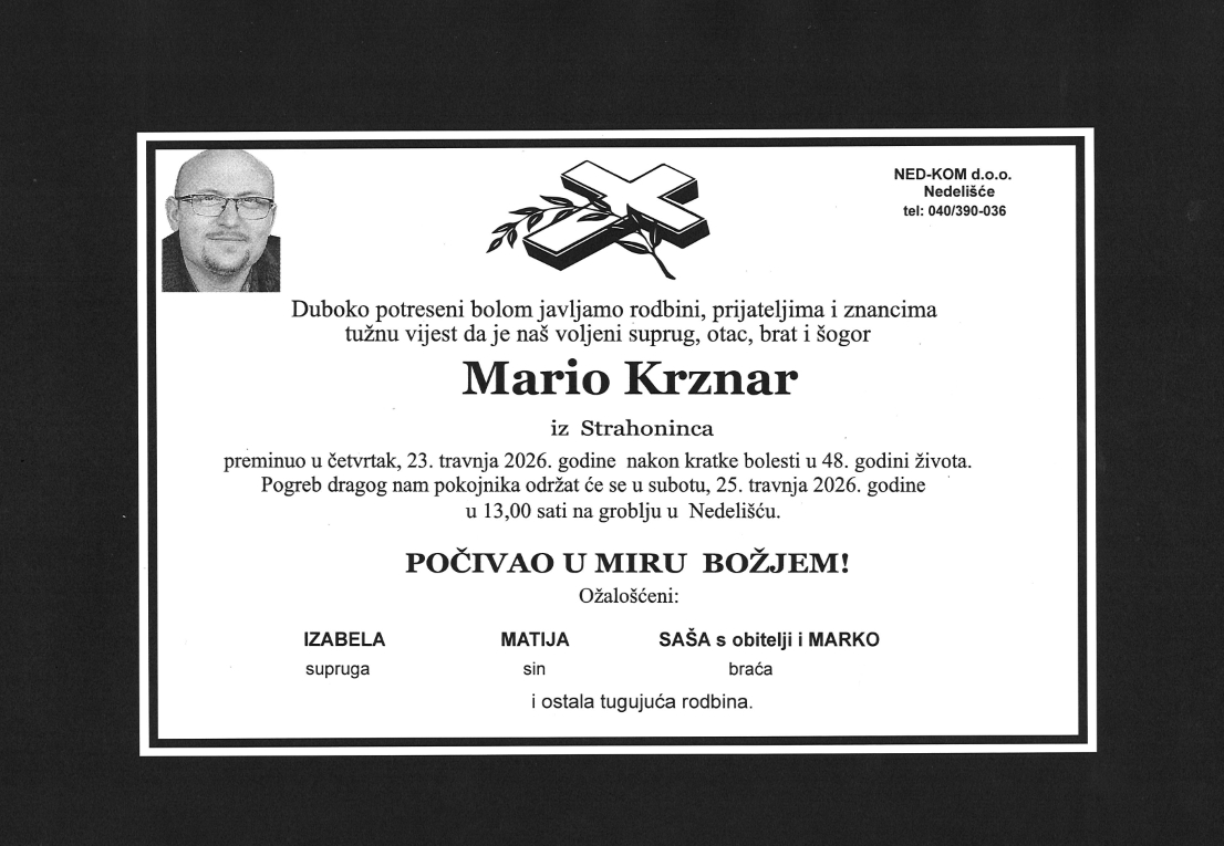 Ispraćaj će se obaviti u subotu, 25.04.2026. u 13:00 sati na groblju u Nedelišću