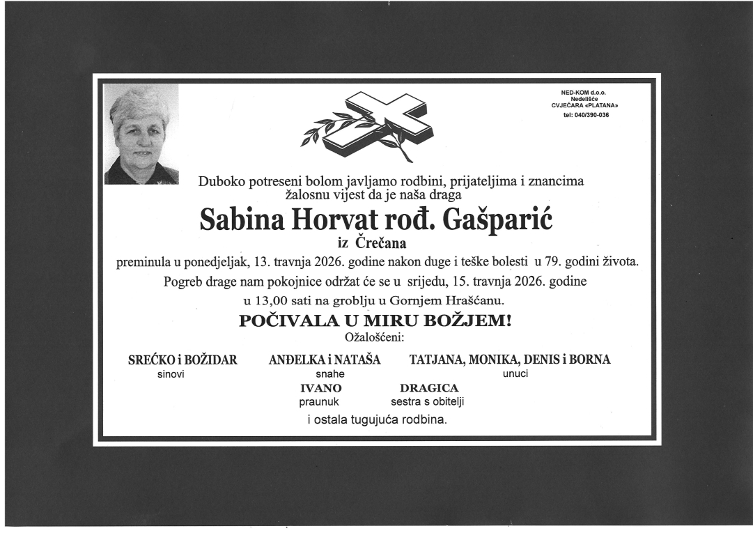 Ispraćaj će se obaviti u srijedu, 15.04.2026. u 13:00 sati na groblju u Gornjem Hrašćanu